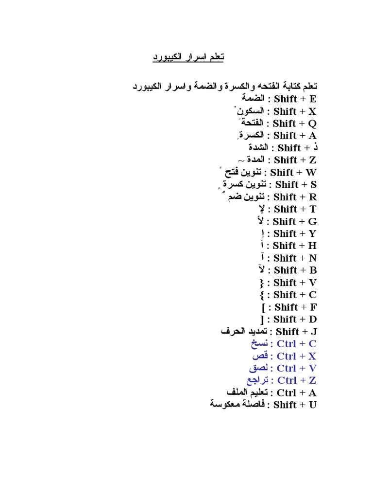 كل اختصارات الكيبورد لوحة المفاتيح وكتابة الحركات بالعربي وتشكيل الكلمات في خمس ورقات فقط